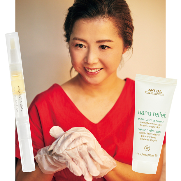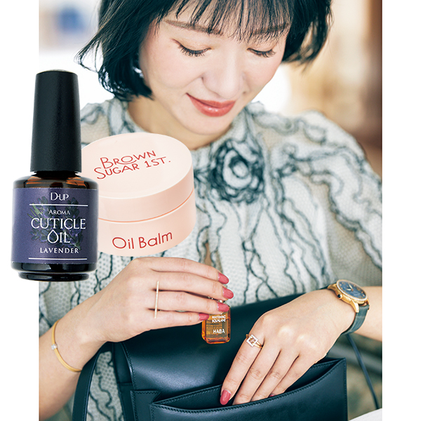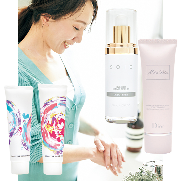 Aēsopのスクラブ入りハンドソープで手を洗うことが毎朝のルーティン。ネイルケアもできるソワのハンド用美容液は朝晩使用。Dior、ポーラのハンドクリームは各バッグに入れて、どのバッグを使ってもハンドクリームが入っているよう徹底しています。