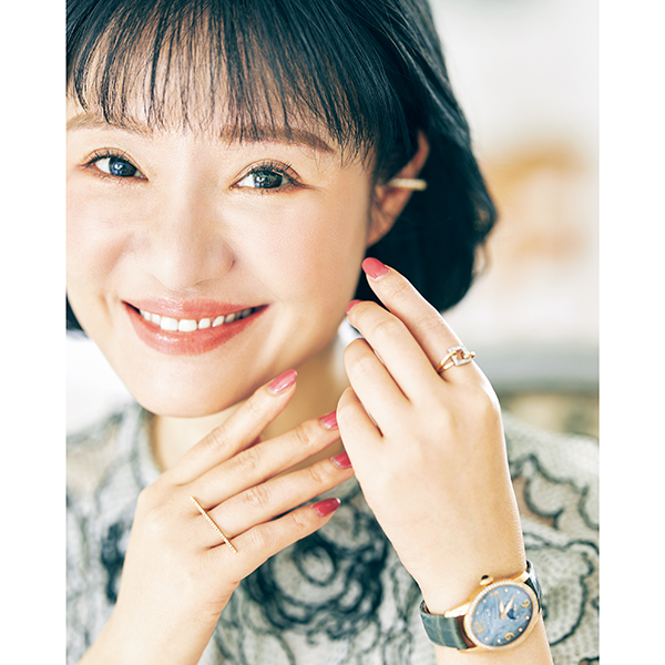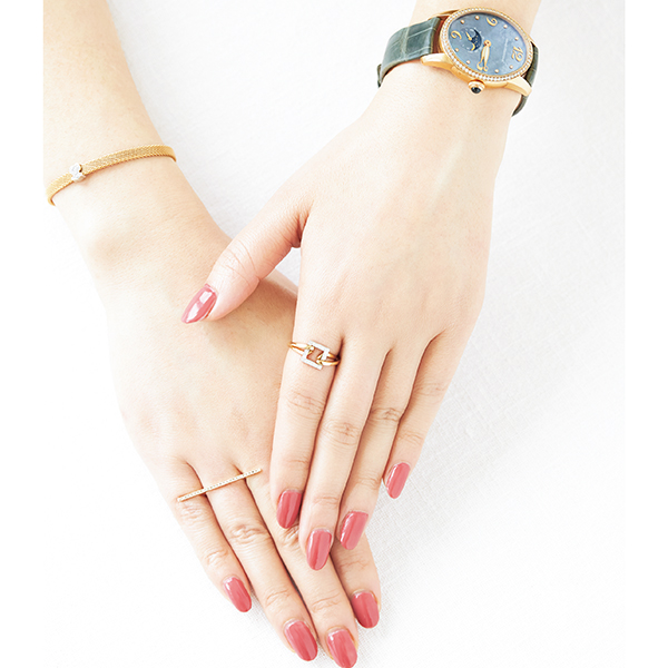 パーソナルカラーがサマーなので、ゴールドのジュエリーを購入する際は、必ずピンクゴールドを選ぶようにしています。時計やバングルが目立つので、あえて指輪は一つ。ネイルも肌の延長のように見えるピンクベージュにしています。