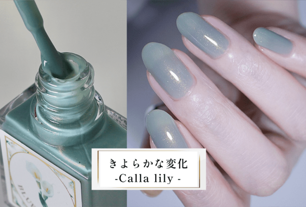 青みのあるノーブルーグリーンをベースとした「Calla lily(カラ リリー)」は、落ち着いた大人っぽい指先に♪