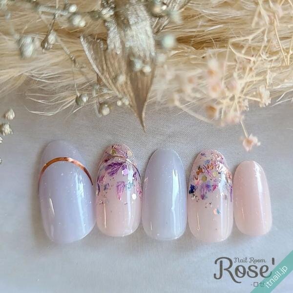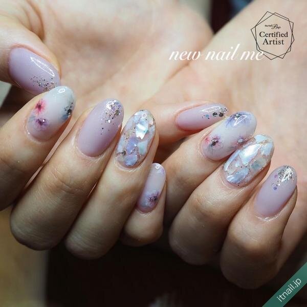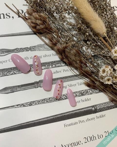 くすみピンクのワンカラーネイルに、シェルや押し花をライン状に入れたデザインも人気があります。お花の道のようなネイルになるので、キラキラしてとても華やかに見えますよ♡少しシアーな色にすると、爽やかさもアップします。