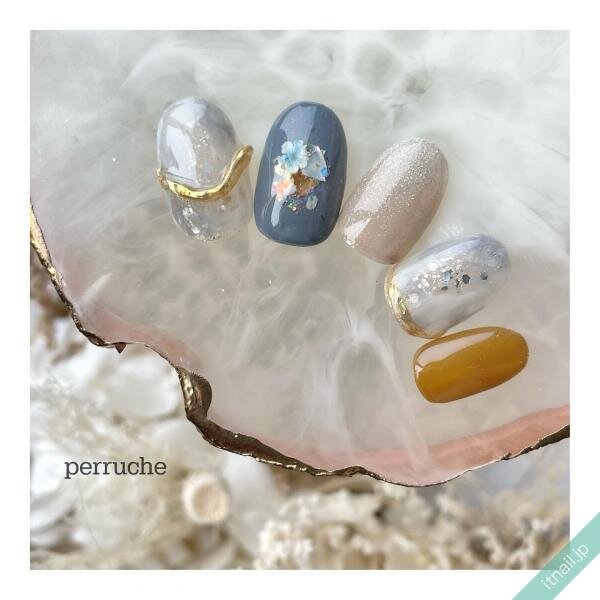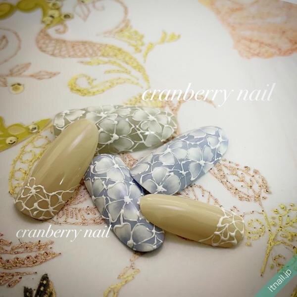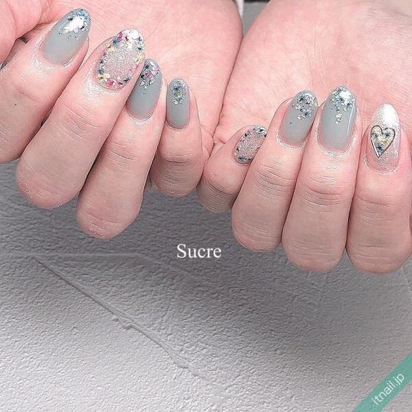 くすみブルーは、少しアンニュイで儚げな雰囲気を意識したいときにぴったりな色です。お花も主張しすぎないように、小さめのデザインを選ぶことがポイント!相性のいいシルバーラメで上品な輝きを足してあげるのがおすすめです。