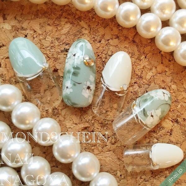 自然を感じるくすみグリーンとお花のネイルデザイン