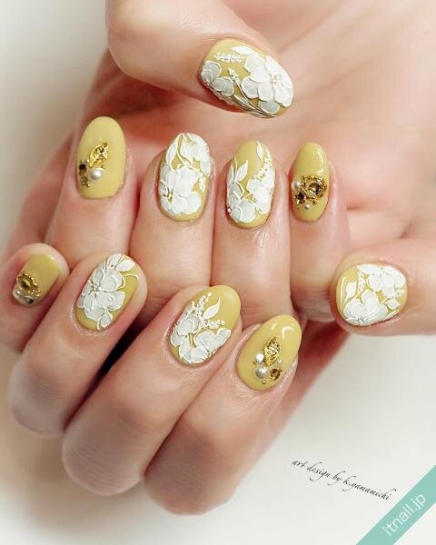 くすみブルーとホワイトのもやもやしたデザインで、ニュアンス感のあるフラワーネイルにするのもおしゃれ!お花も少しブルーがかった色にして、統一感を出すといいですよ♪差をつけたいときは、ワンポイントにブラウンやイエローを入れるのも◎。