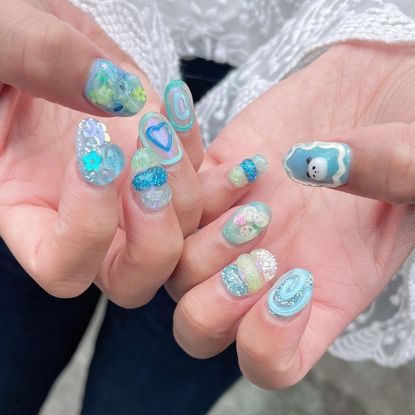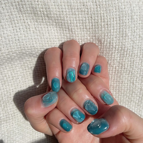 お次は、透明感が涼しげなぷくぷくの「クリアブルーネイル」。ブルーのクリアネイルと水滴のようなぷっくりデザインから、夏感が伝わってきます。