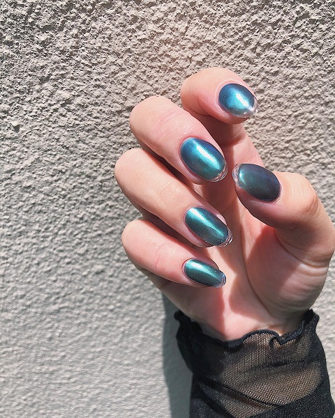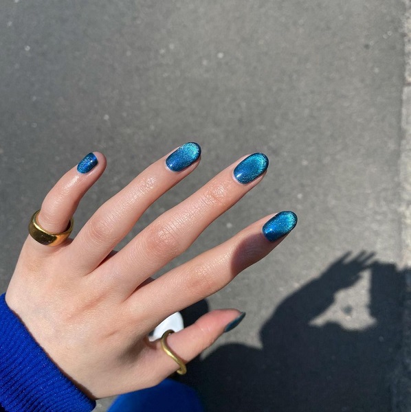 独特な輝きを放つ「ブルーのマグネットネイル」は、ワンカラーでもおしゃれに仕上がるデザインです。