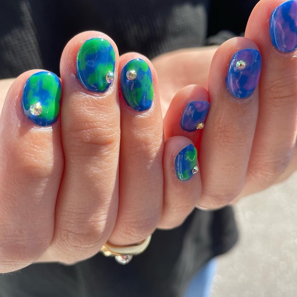 クールな色味と宇宙のようなミステリアスな模様が、魅力的ですよね。天然石のように輝く爪先は、艶やかで大人っぽい印象に。