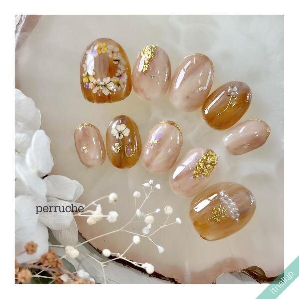 ブラウンのもやもやしたネイルデザインをベースに、押し花をのせて可愛らしい雰囲気をプラスするのもおしゃれです。押し花のリースデザインが甘く見えないので、大人でもチャレンジしやすいデザインですよ♪パールのお花で輝きを足すのもおすすめ!