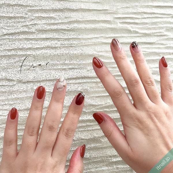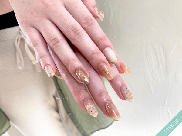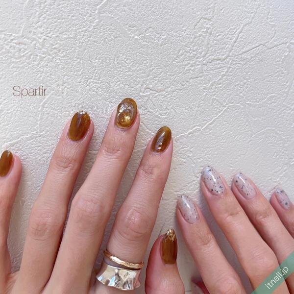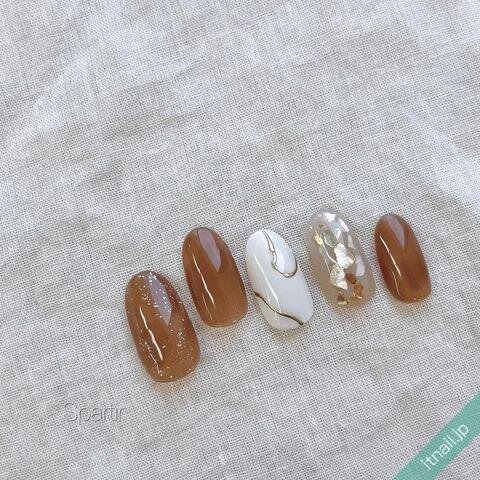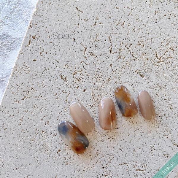 もやもやしたデザインで、ニュアンス感のあるブラウンネイルにするのも夏に人気です。ベージュやオフホワイトと混ぜながら、マイルドなブラウンネイルへ♡さらに、ちゅるんとした仕上がりにすると、今どきらしいおしゃれネイルが楽しめます。