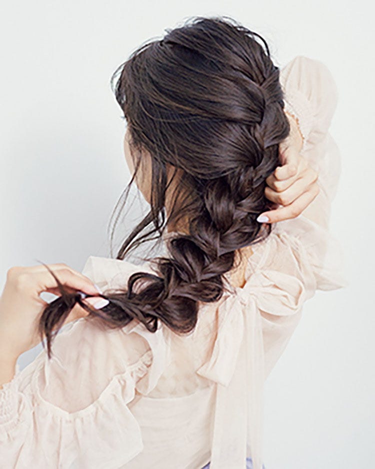 耳上位置から先は三つ編みに切り替える。毛先まで編み、ゴムで結んだら、編み束の左右から髪を引き出す。