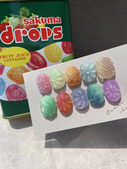 他にはないデザインがあまりに魅力的で制作までの経緯を伺ったところ、以前にもサクマドロップスのネイルチップを作ったことがあるのだとか。今回は前回とは違う色で制作され、現物の飴に色を寄せるのではなくオリジナルの配色にしたそうです。