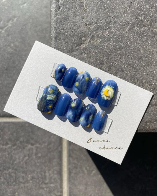 フィンセント・ファン・ゴッホの「星月夜」がモチーフとなったネイルチップには、印象的な三日月や糸杉、渦巻きなどが再現されています。