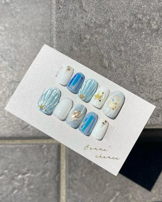 大きなシェルが描かれたマーメイドネイルはこれからの季節にぴったり。