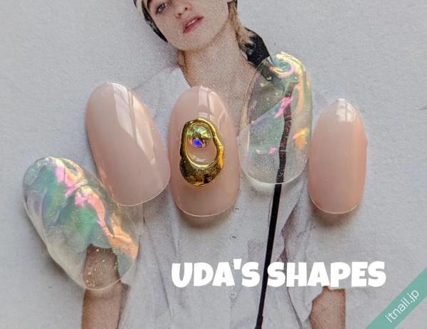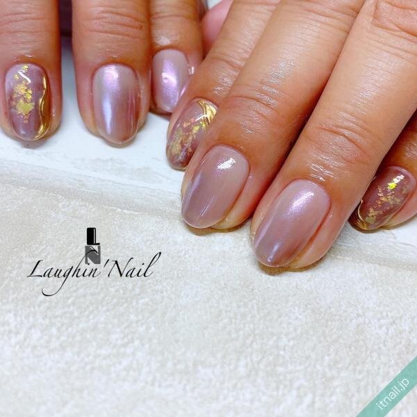 ピンクからブラウンに変化するオーロラカラーは、ナチュラルなのにモード感漂うカラー。それを活かしてワンポイント金箔とゴールドミラーネイルで高級感アップ。カジュアルなオフィスなら許されるデザインです。