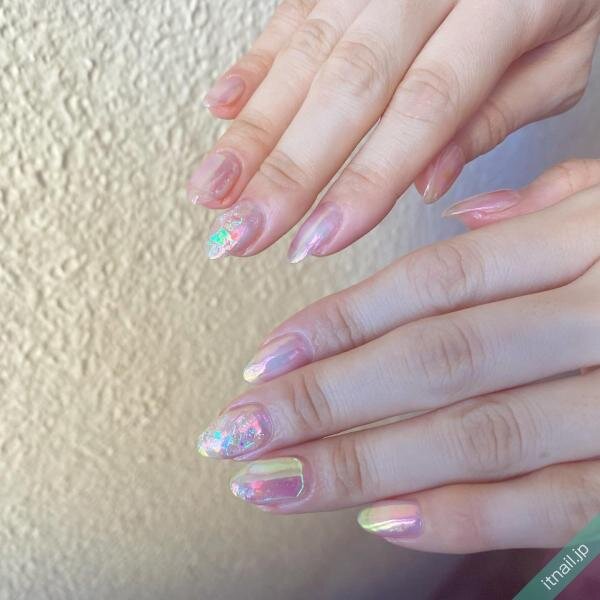 オーロラカラーにラメという異なる輝きがさり気なくお洒落なネイル。アートが無くてもこの輝きだけで十分華やかです。艶やかなオーロラカラーは見た目も涼やか。シンプルなのに女性らしいネイルは、いろんな世代から好感度抜群なネイルです。