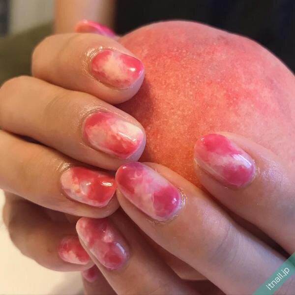 桃の模様を意識したデザインは、すべての爪に入れても可愛いのが魅力!桃の白いところとピンクのところを上手に入れて、色使いで差をつける桃ネイルへ♡ランダムな濃さが可愛くて、ずっと眺めていたくなりますね♡
