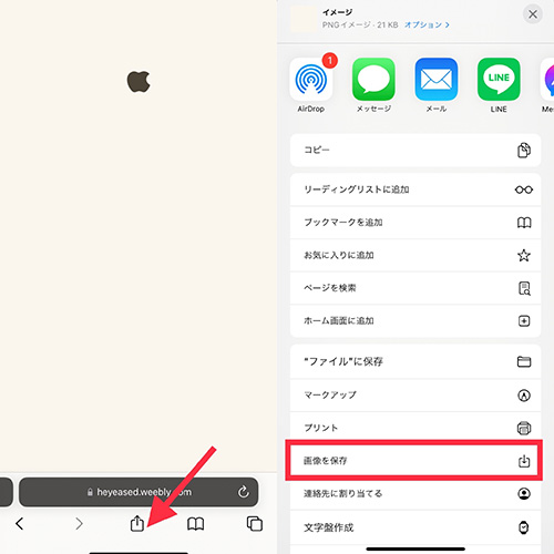 壁紙の画像が表示できたら、シェアボタンから『画像を保存』を選択。