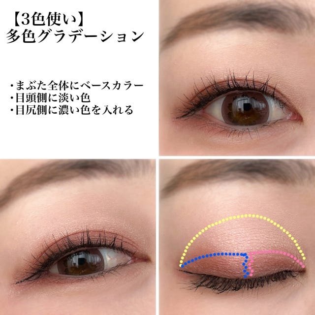 メイク上級者さんは3色使ってメイクしてみましょう!淡い色をベースに、目のキワに入れる締め色で2色グラデーションを。アイシャドウの入れる位置を覚えると簡単に仕上げられるのにより立体感が出て一気にメイク上手に見えます。