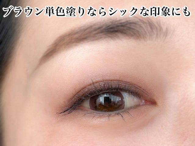 ブラウン1色だけの単色使いならシックな印象にも見えるのでオススメです!クリーム系のアイシャドウやパールのように細かいラメ入りのものなら目の凹凸に合わせて自然に立体的に見えますよ。
