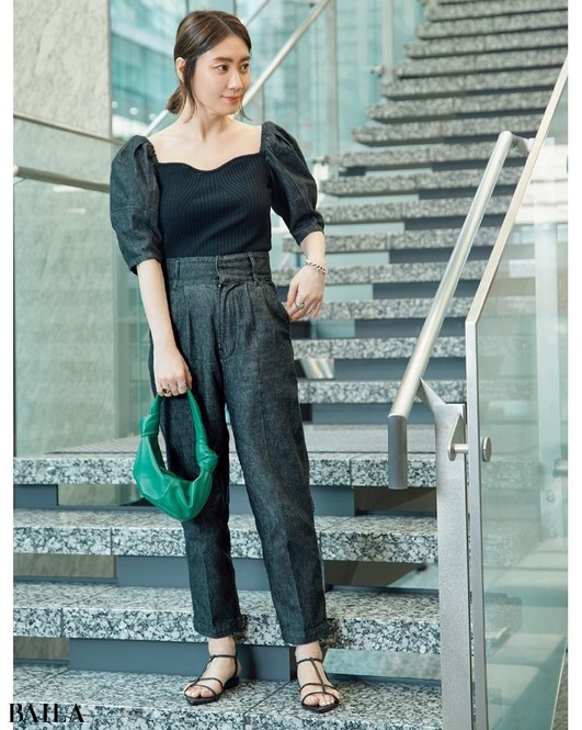 「ニット×デニムの異素材コンビならオールブラックが軽い印象に。トレンドの甘い袖も黒デニムがラフさをくれるから着やすくて。足もとはヌーディなサンダルで夏らしさを足しています」