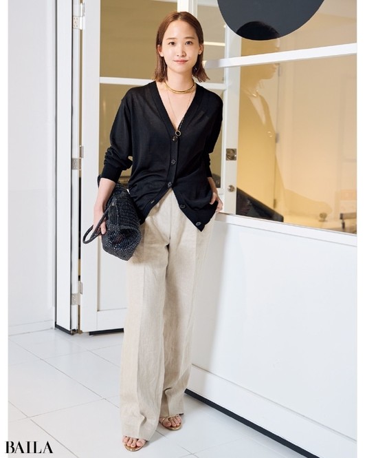 「夏の黒は重くならないよう質感重視。黒のシアーカーディガンは軽さのなかに女性らしさを感じます。服の配色が落ち着いているので、大ぶりのゴールドのアクセで統一してツヤで華やかに」