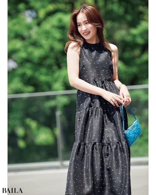 「黒は強い色だからシルエットや小物使いで抜け感を出すのが大切。黒ワンピでもアメリカンスリーブだからラフな印象に。刺しゅうの一色をバッグに拾って効かせているのもポイントです」