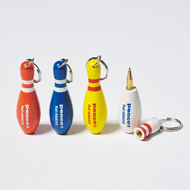 ボウリングのピンを模した木製のキーホルダー。ピン先を開けるとボールペンに早変わり。商品名はボウリングとボールペンをかけた「ボウルペン」。