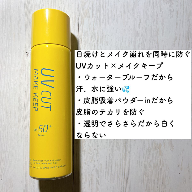 夏のお悩みといえば、メイク崩れと日焼け。ここ最近は、この2つを一気にカバーできるアイテムをずっと使っています。その名も「UVカット&メイクキー スプレー」。SPF50+ PA++++の日焼け止め効果と、皮脂吸着パウダー入りのスプレーが一体になっています。
