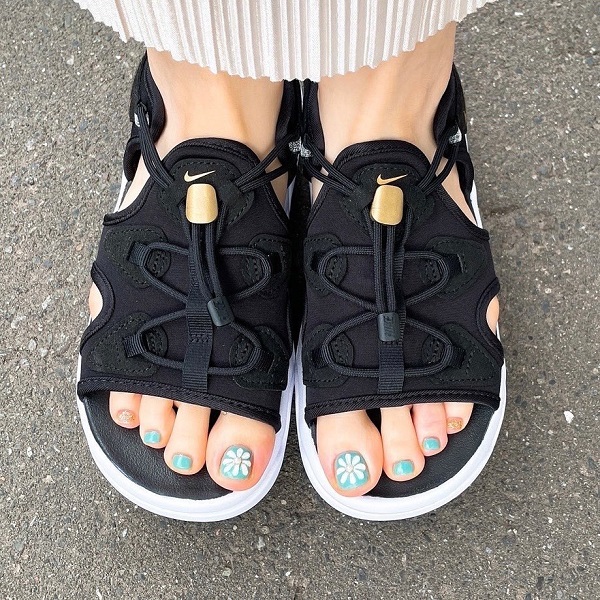 合わせるのが難しい印象の水色は、黒色のサンダルと相性抜群!水色ベースにお花をデザインすることで、涼しげで爽やかな足元に変身しちゃうんです。