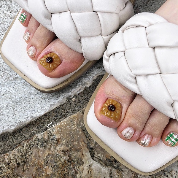 トレンドの“スポサン”や“グルカサンダル”と合わせるなら、水色のフラワーネイルはいかがでしょう。