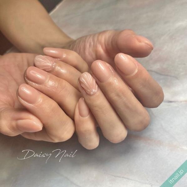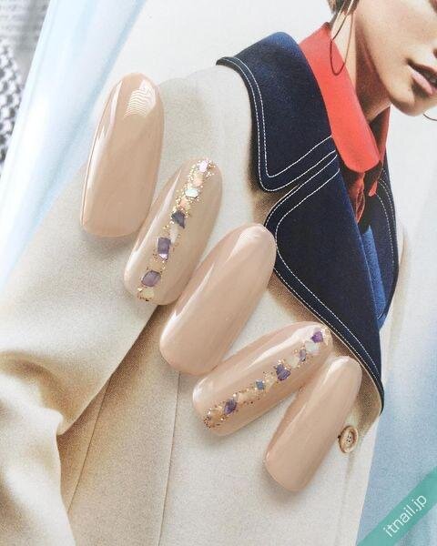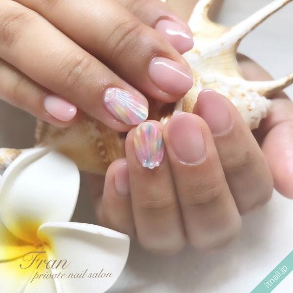 ベースカラーはベージュでシンプルにして、シェルで差し色を。ベージュとパープルやブルー系の組み合わせは、エレガントな印象を与えてくれます。またシェルを縦に置くことで、指が長く見えるうれしい効果も。