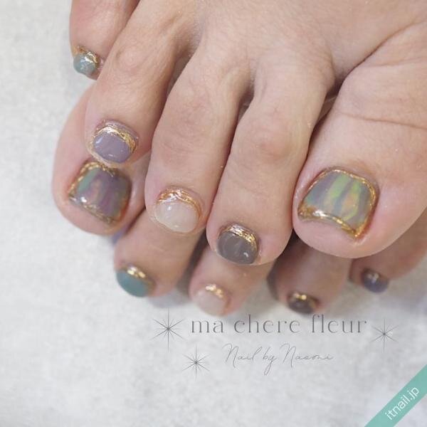 オーロラのフットネイルは、ミラーアートとの相性が抜群!囲みミラーにしたり、ミラーフレンチにしたりして、異なる輝きを楽しんでみて♪グレイッシュな色であれば、落ち着いた大人向けのフットネイルになります。