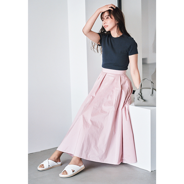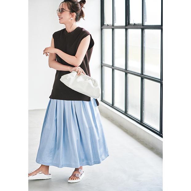 サンダル¥59,400(ビルケンシュトック/ビルケンシュトック・ジャパン カスタマーサービス)スカート¥42,900(ツル バイ マリコ オイカワ)トップス¥19,800(ボッシュ)バッグ¥36,300(ブレンテラ/ハウス オブ ロータス 二子玉川店)ピアス¥9,900(ニナ・エ・ジュール/ショールーム 233)サングラス¥35,200(ブラン)
