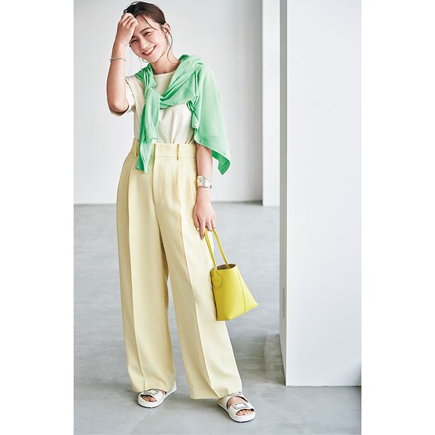 サンダル¥27,500(ツル バイ マリコ オイカワ/ユナイテッドアローズ エルティーディ オンラインストアー)パンツ¥15,950(アンクレイヴ スタンダード/アンクレイヴ)Tシャツ¥9,900(ブラックバイマウジー/バロックジャパンリミテッド)カーディガン¥26,400(ティッカ/アッシュプラスエリオトロープ)バッグ¥77,000(J&M デヴィッドソン/J&M デヴィッドソン 青山店)右手ブレスレット¥19,800(SASKIA DIEZ/LE PHIL NEWoMan 新宿店)左手ブレスレット¥66,000(ニナ・エ・ジュール/ショールーム 233)