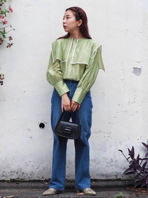 トレンドのビッグカラーブラウスを合わせたデニムコーデは、重心が上がるのでスタイルアップ効果が期待できます。