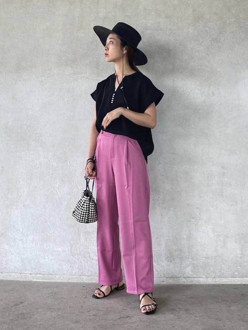 ピンクのパンツを選ぶと、パンツコーデもフェミニンに見えますよ♡