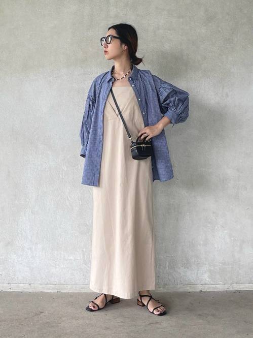 【夏編】ぽっちゃりさんにおすすめのブラウスコーデ④ストライプ柄ブラウス×キャミワンピース