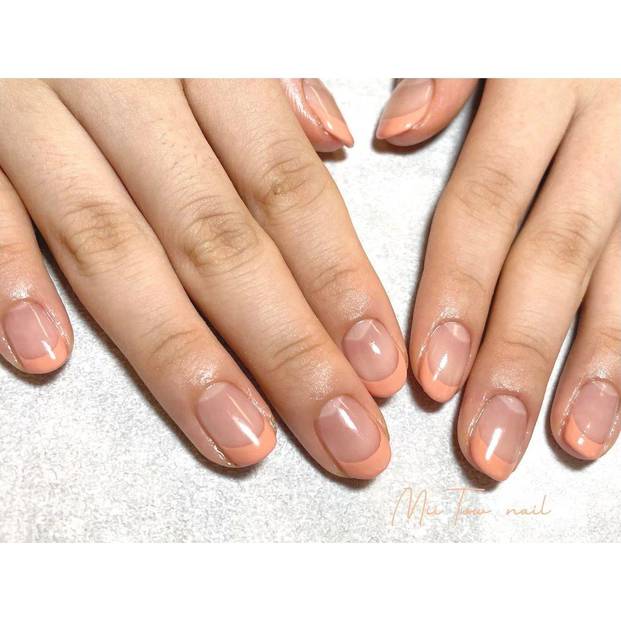 ヘルシーに色っぽい指先を叶えてくれる、コーラルピンクをカラーフレンチで楽しむ夏ネイルデザインです。