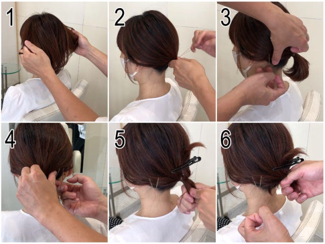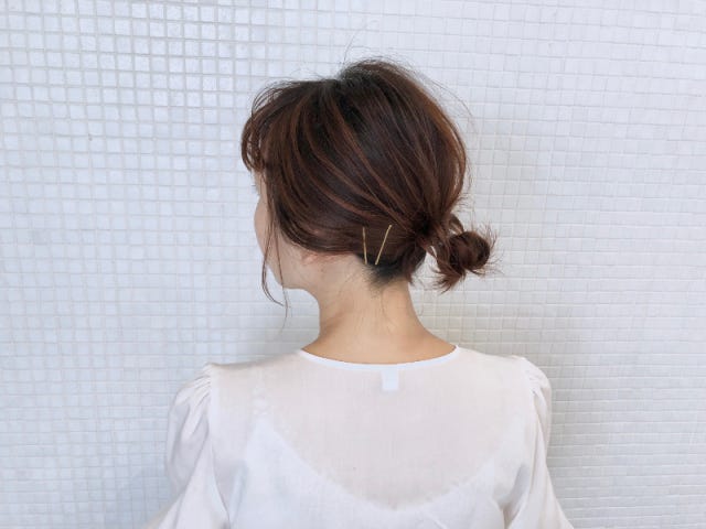 ⑥ 根元に丸めピン留めします。(飛び出た髪の毛をUピンでおさえます)