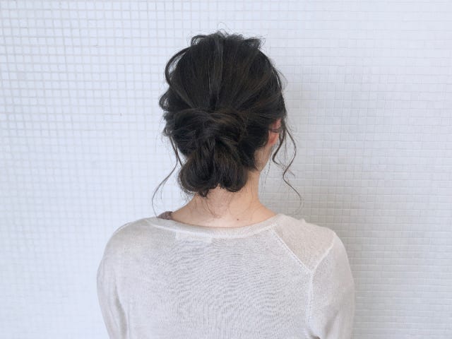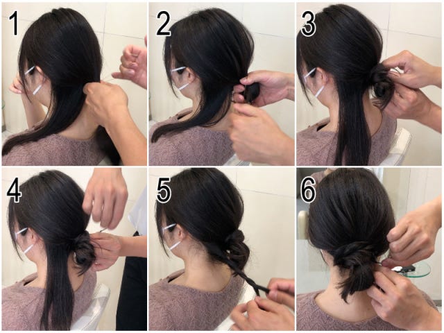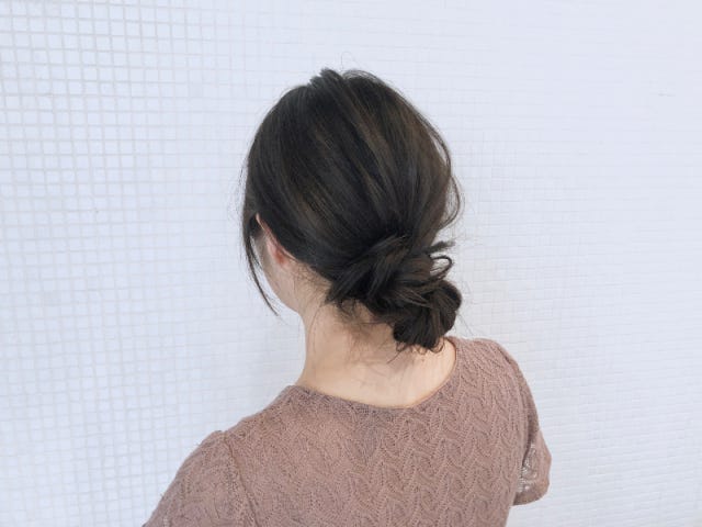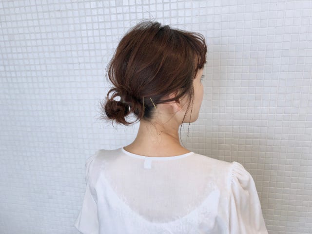 ⑤ 残しておいた左右の毛先をネジりながらお団子の根元に巻きつけピン留めします。