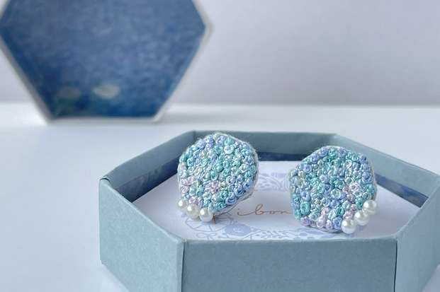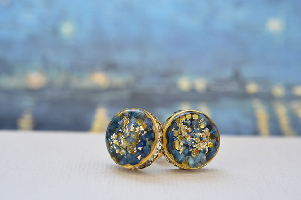 さまざまな種類の青を織り交ぜたベースに、ゴールドのホログラムや淡い金箔をプラス。角度によって上品にきらりと輝くピアスです。
