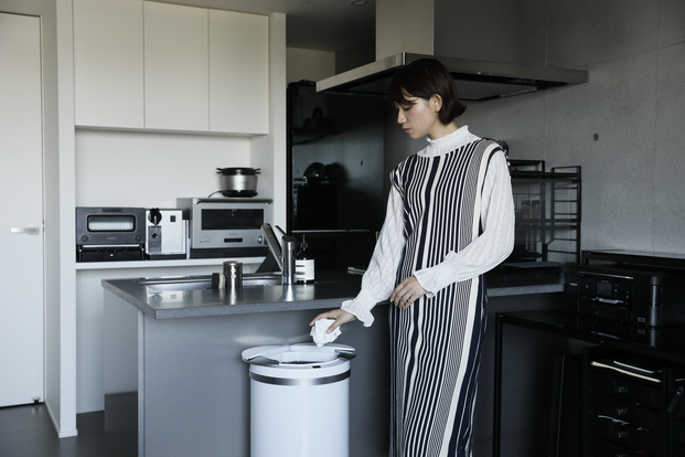 一見、ゴミ箱とは思えないほどのスタイリッシュなデザインも魅力。横開きの投入口でにおいが漏れにくく、高さを気にせずカウンターの下などでも使いやすいのがポイント。さまざまなお部屋に合いそうなホワイトをお届け。