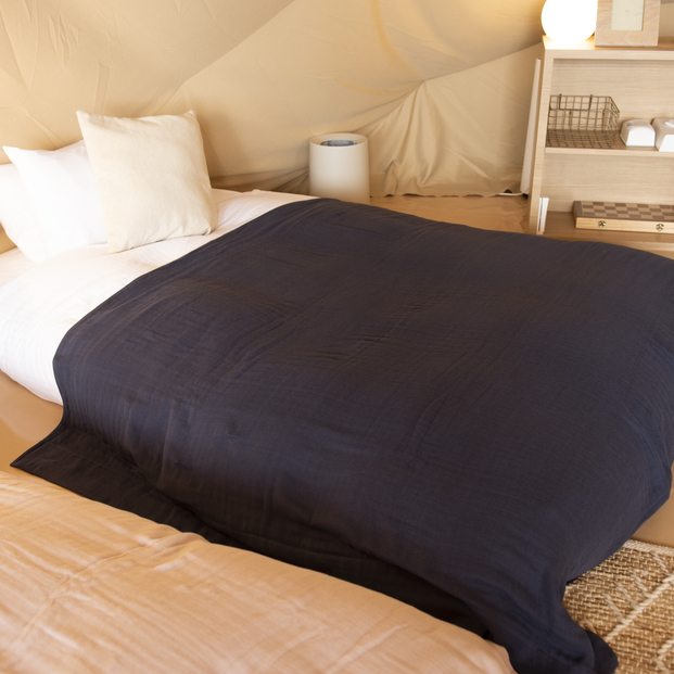 5重ガーゼで作られているので、洗濯するたびにボリュームと風合いがでてきます。カラーは落ち着いたネイビーをプレゼント♡グランピングなど、アウトドアに1枚持っていくのもおすすめです。