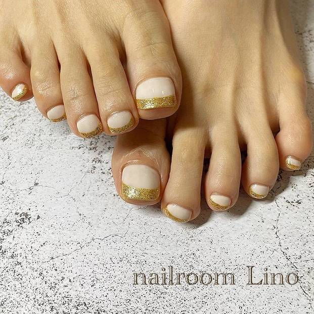 自爪と馴染むシアーホワイトにゴールドフレンチを合わせた、夏におすすめのフットネイルデザインです。