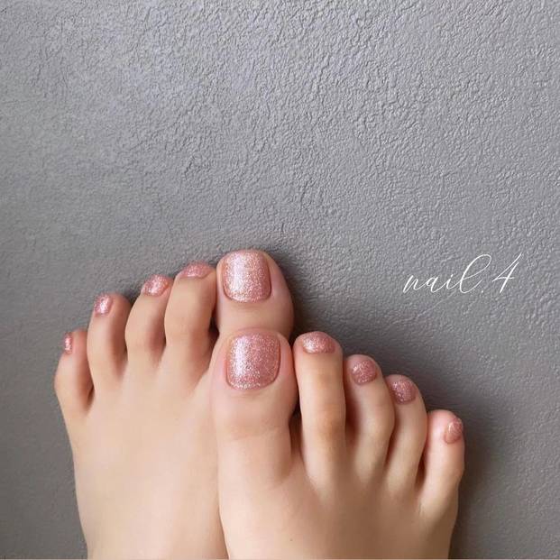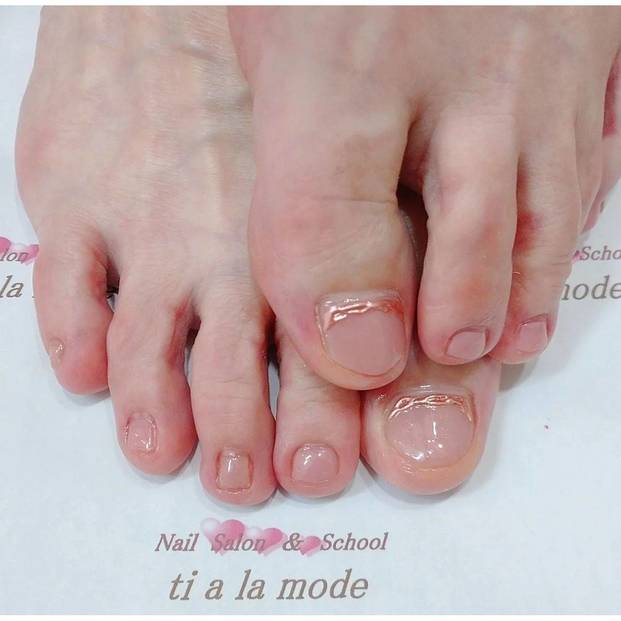 落ち着いたくすみローズのワンカラ―に、ミラーの質感と輝きがアクセントに効かせたおしゃれなフットネイルデザインです。