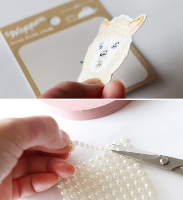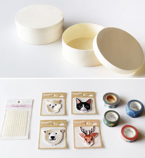 小箱のベースとなる木製ボックスはダイソーで、ラインストーンシールとアニマルワッペンはセリアで購入しました。