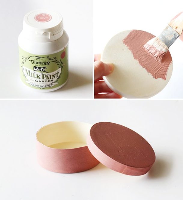 木製ボックスを好みの色にペイントします。今回は「ミルクペイント」シリーズの水性塗料で塗ってみました。