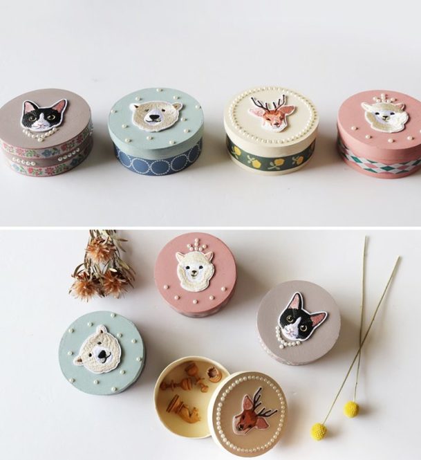 ほっこりキュートなアニマル刺繍がポイントのラウンドボックス。小物入れとしてももちろん、並べて飾っておくだけでも楽しむことができる可愛らしい小箱です。