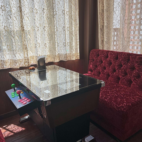 2階には、雰囲気のあるソファが用意されています。写真の中央に写っているのは、なんとインベーダーゲームのテーブル。