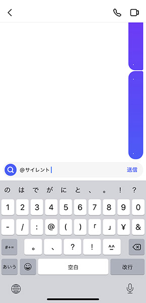 まず、メッセージ入力部分の冒頭に「@」マークを打ち込んでください。『サイレント』の案内が登場するので、これをタップ。