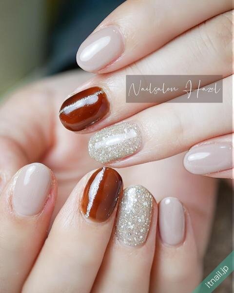 ブラウンやベージュといった落ち着いた大人カラーのネイルでまとめて、グリッターの敷き詰めネイルも上品に♪大人向けの品のあるネイルになるので、オフィスはもちろん、きちんと感が欲しいときにもおすすめです。